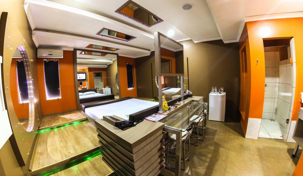 TV 32, CANAIS EROTICOS, SECADOR DE CABELO, SOM, AR -CONDICIONADO, FRIGOBAR, DUCHA, BOX DE VIDRO, INTERNET, CAMA QUADRADA, ESPELHOS NO TETO, FRENTE E LATERAL DA CAMA, ILUMINAÇÃO EM LED, GARAGEM PRIVATIVA